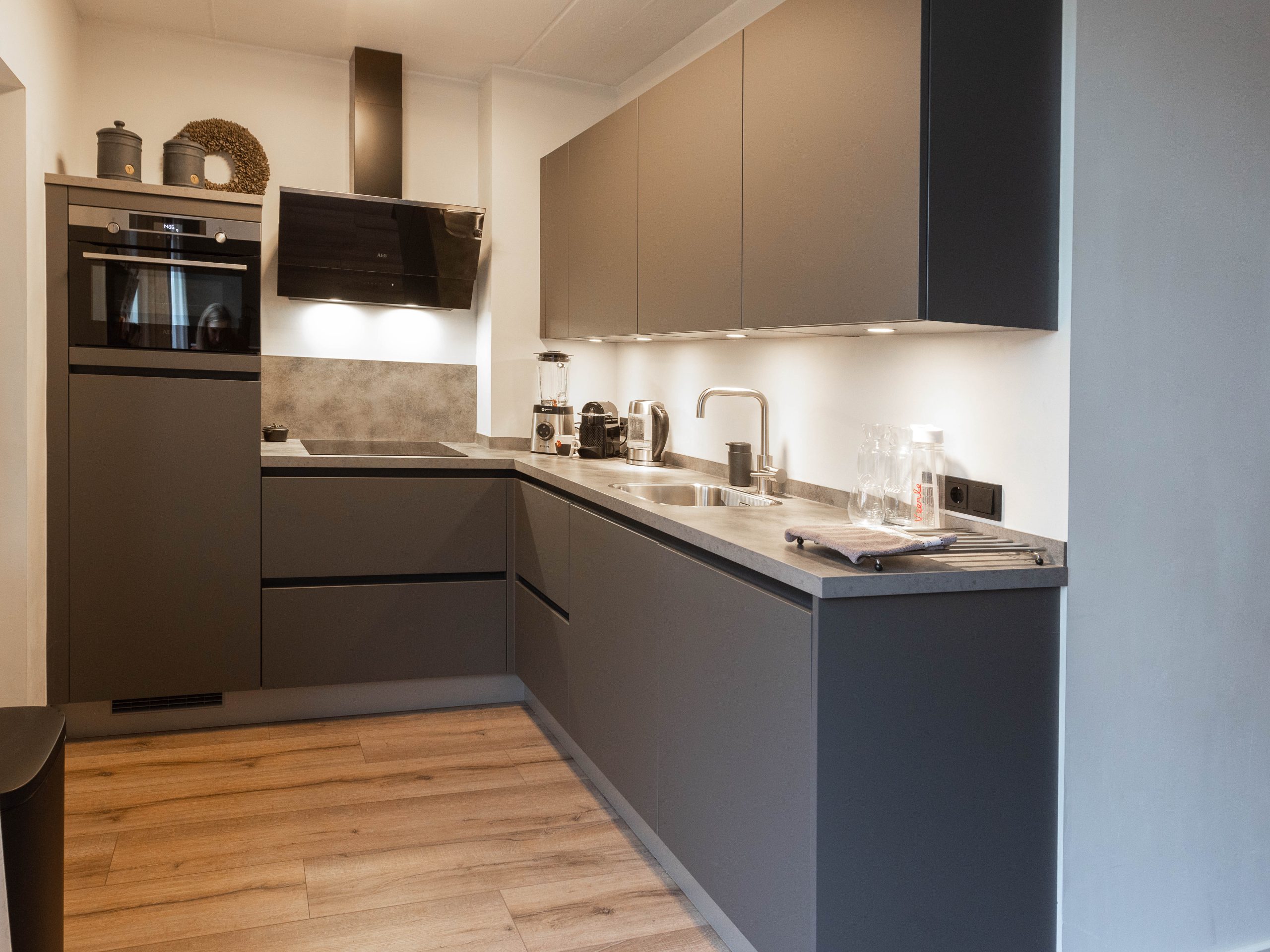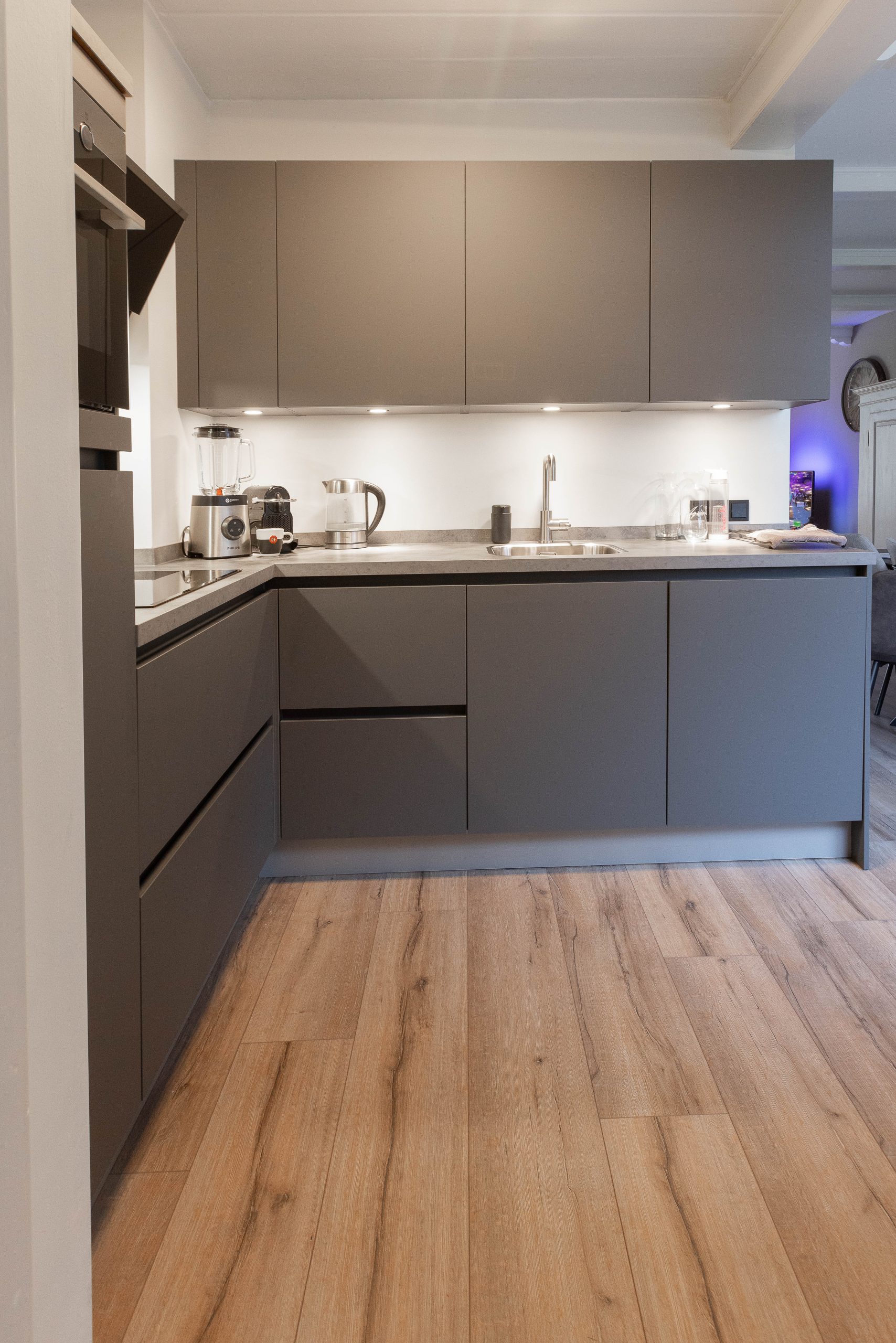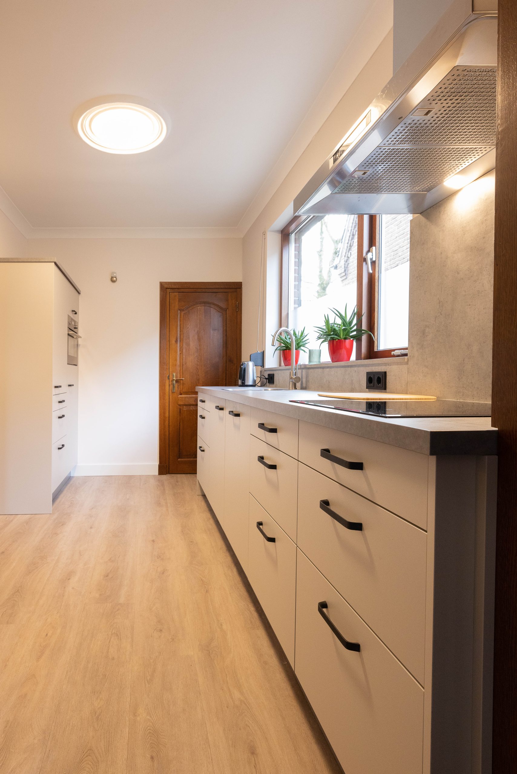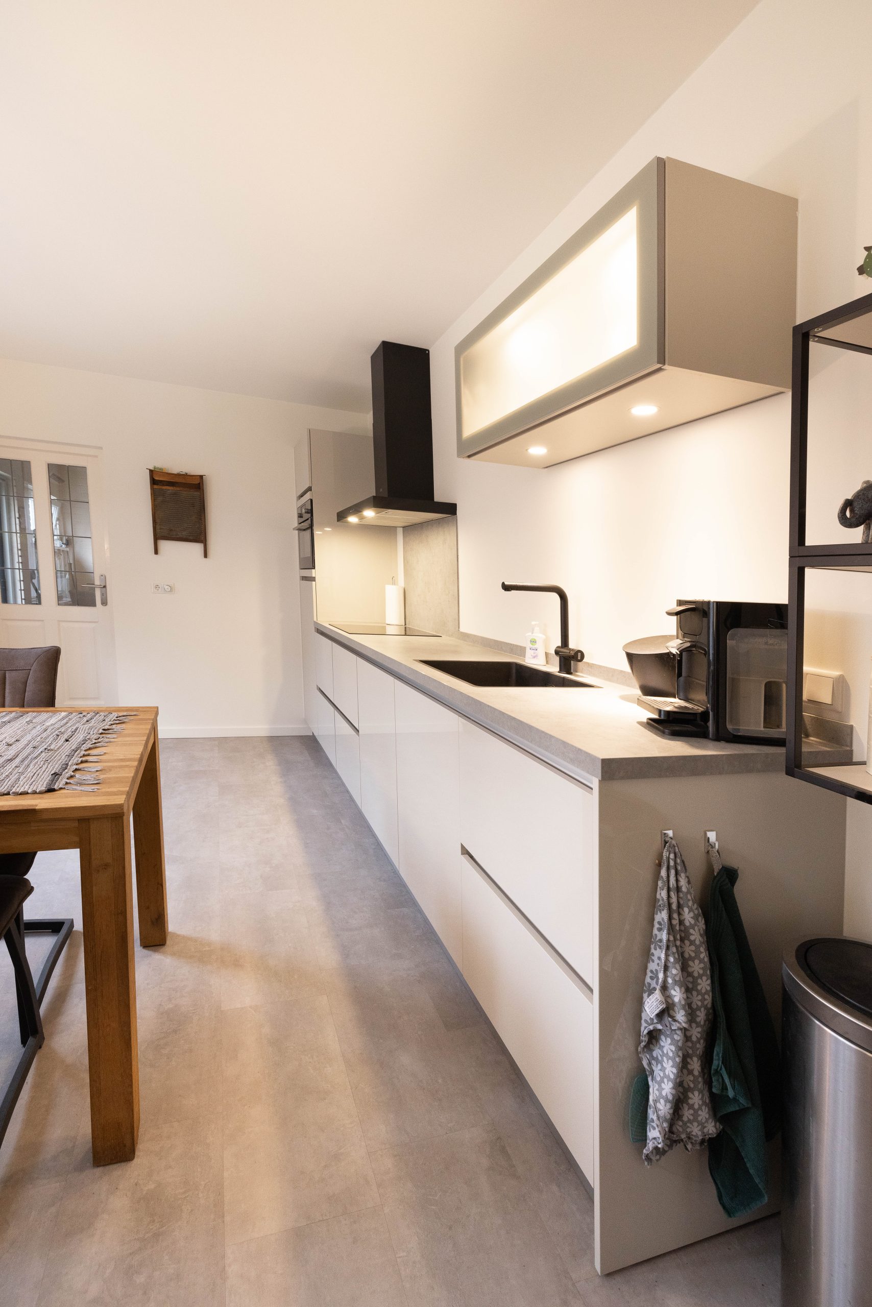 We hebben nieuwe fronten en andere grepen geplaatst, wat meteen een andere sfeer geeft. De effen aluminium achterwand zorgt voor een strakke, rustige uitstraling. Daarnaast hebben we het schilderwerk aangepakt en zowel de afzuigkap als de koelkast vervangen.