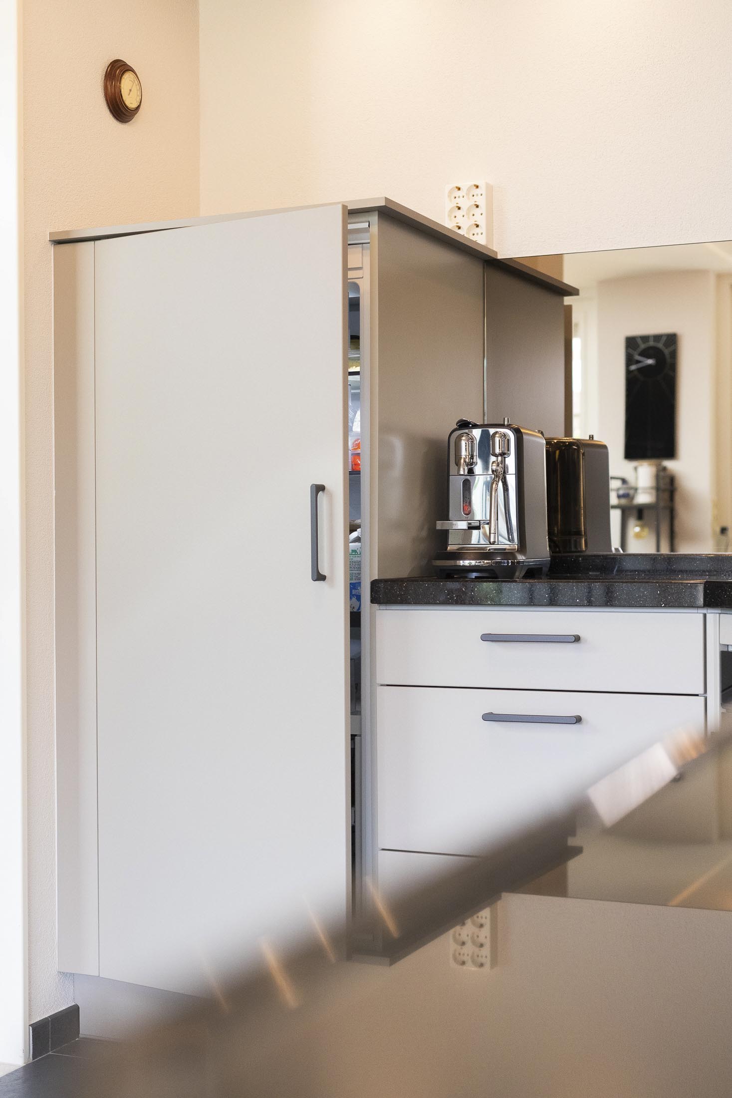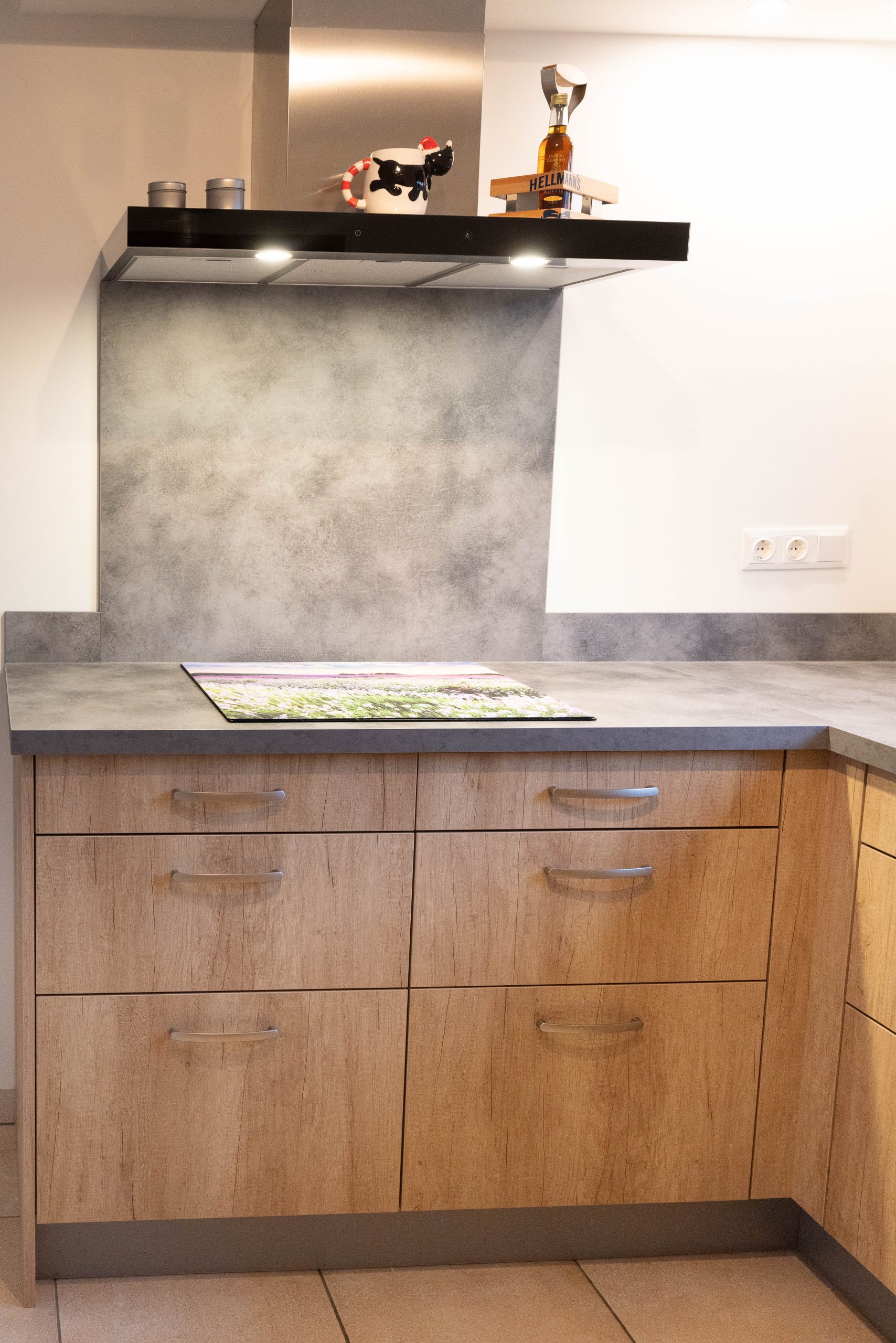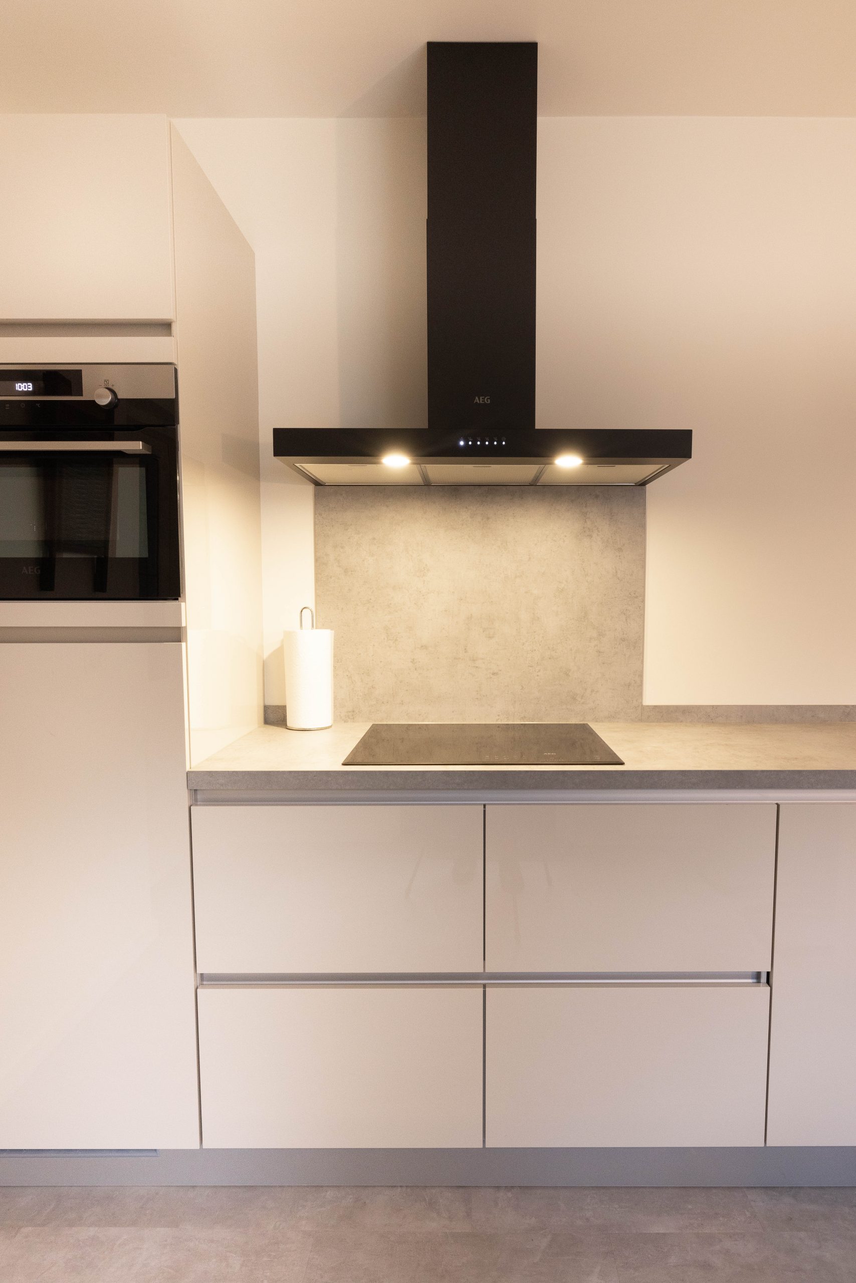 We hebben nieuwe fronten en andere grepen geplaatst, wat meteen een andere sfeer geeft. De effen aluminium achterwand zorgt voor een strakke, rustige uitstraling. Daarnaast hebben we het schilderwerk aangepakt en zowel de afzuigkap als de koelkast vervangen.