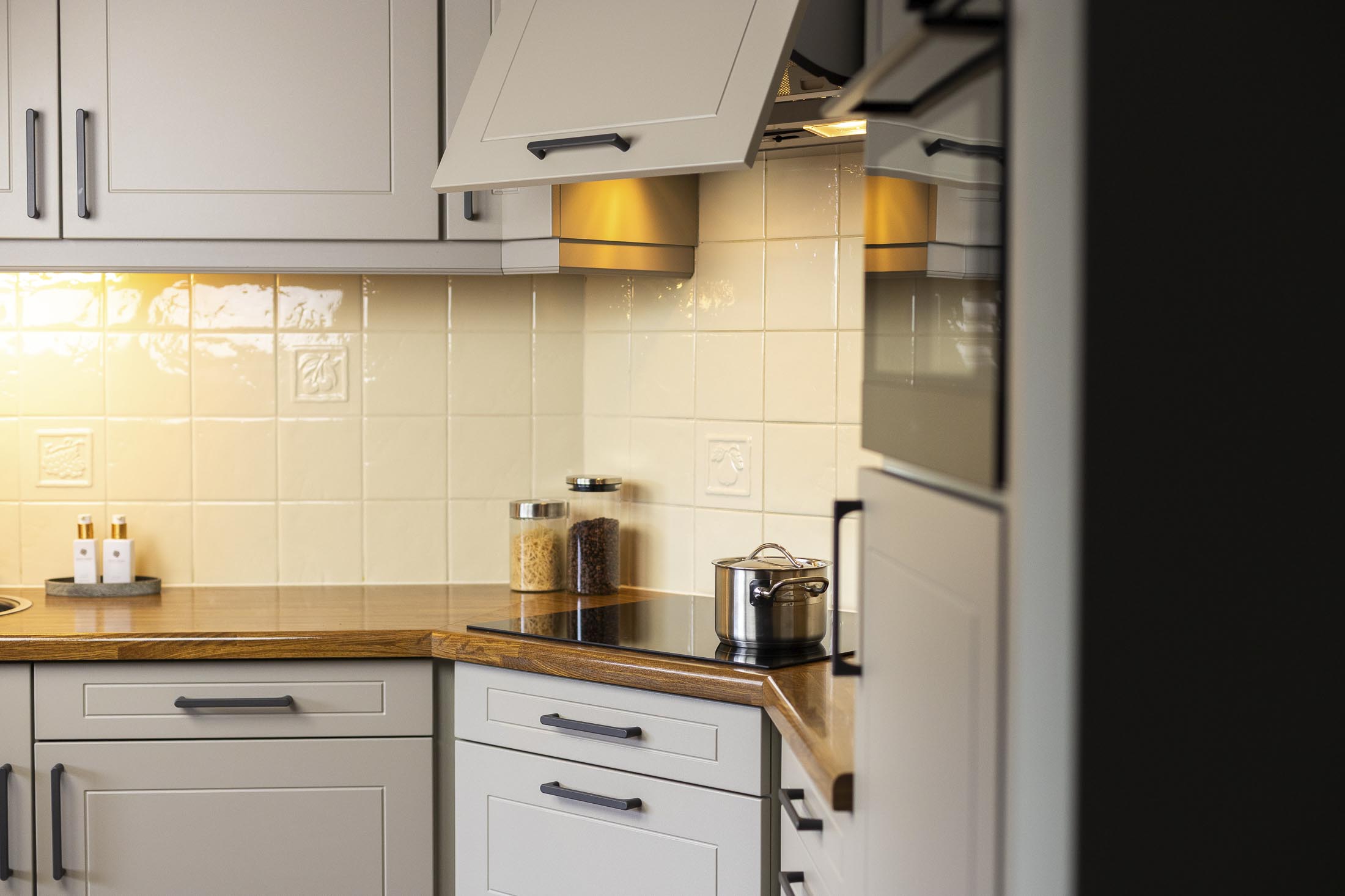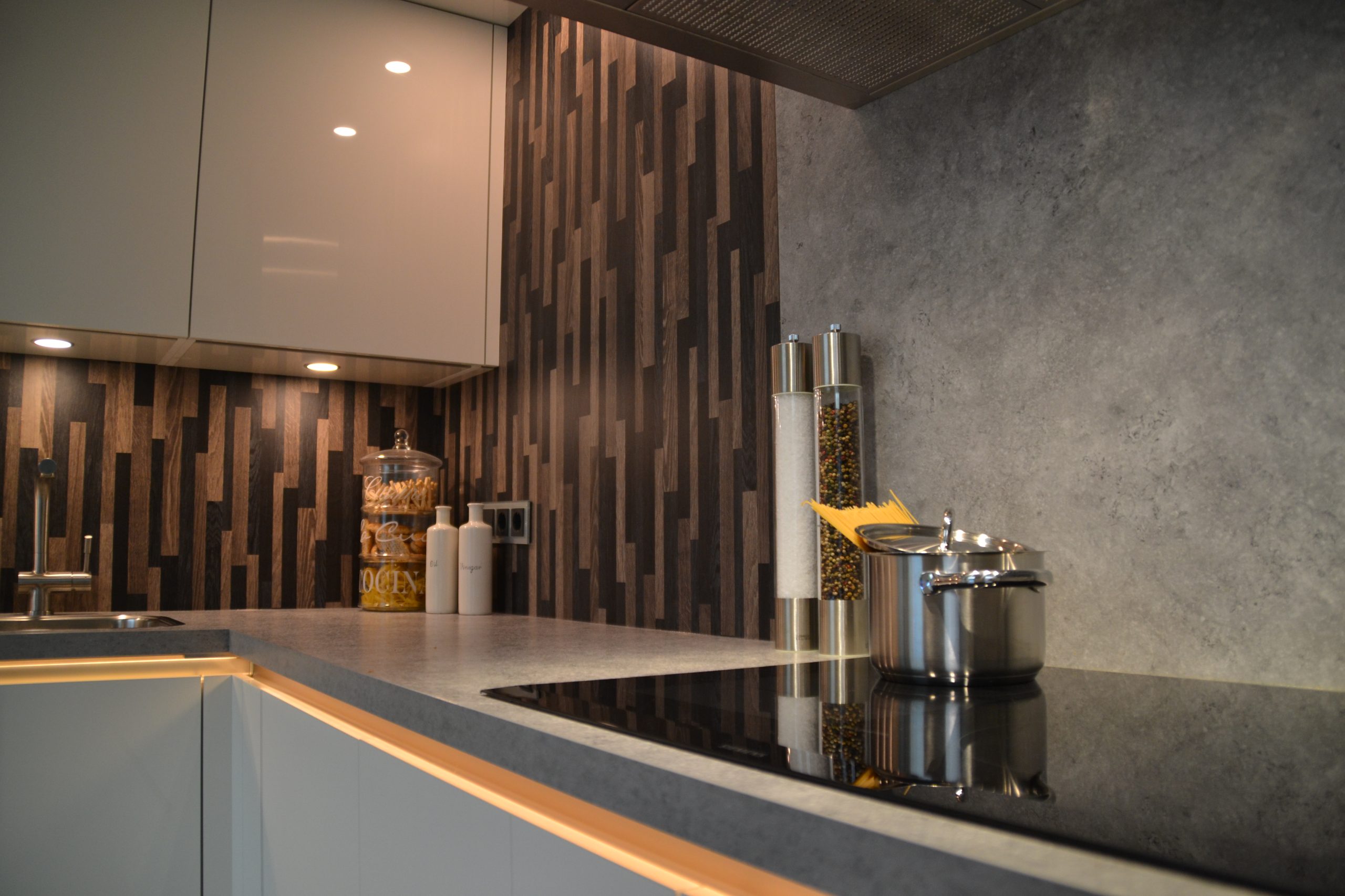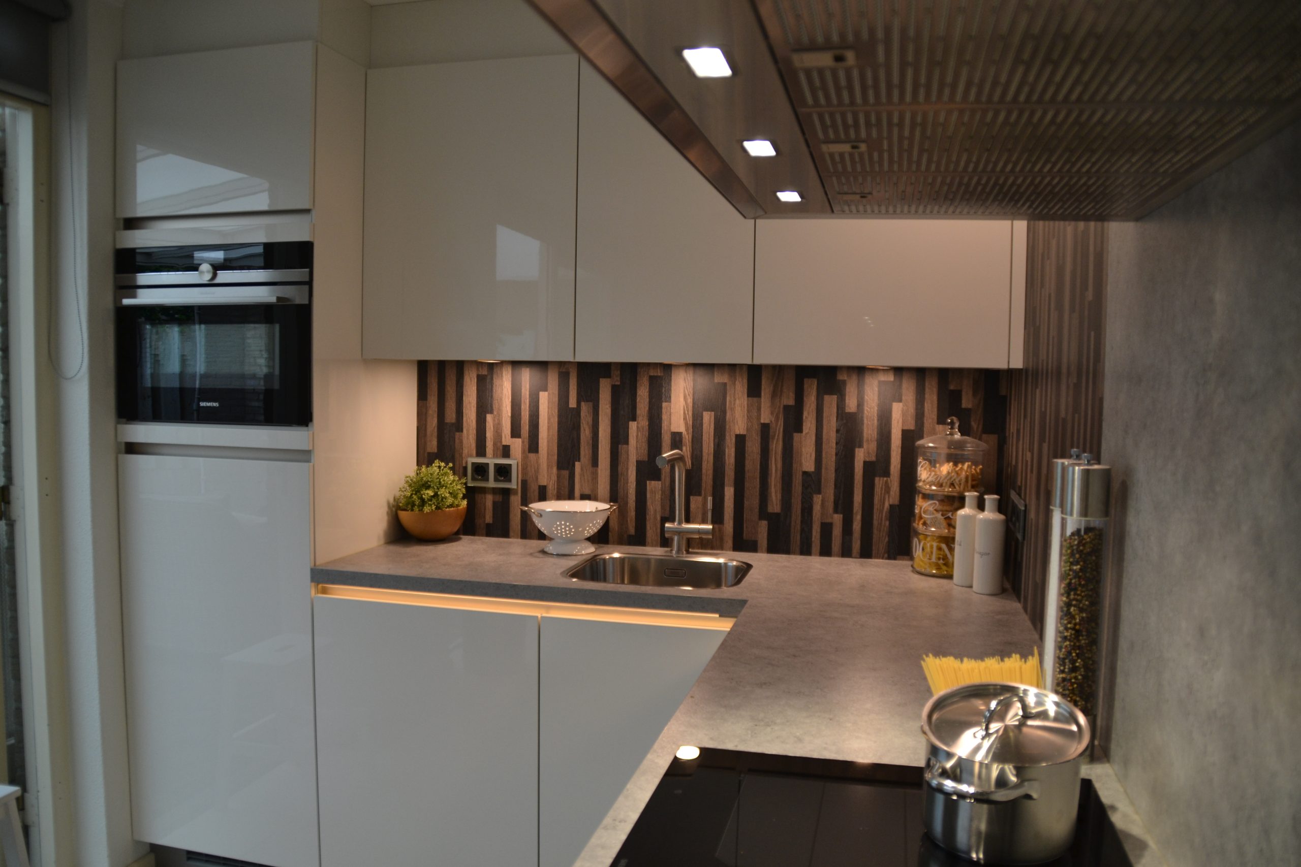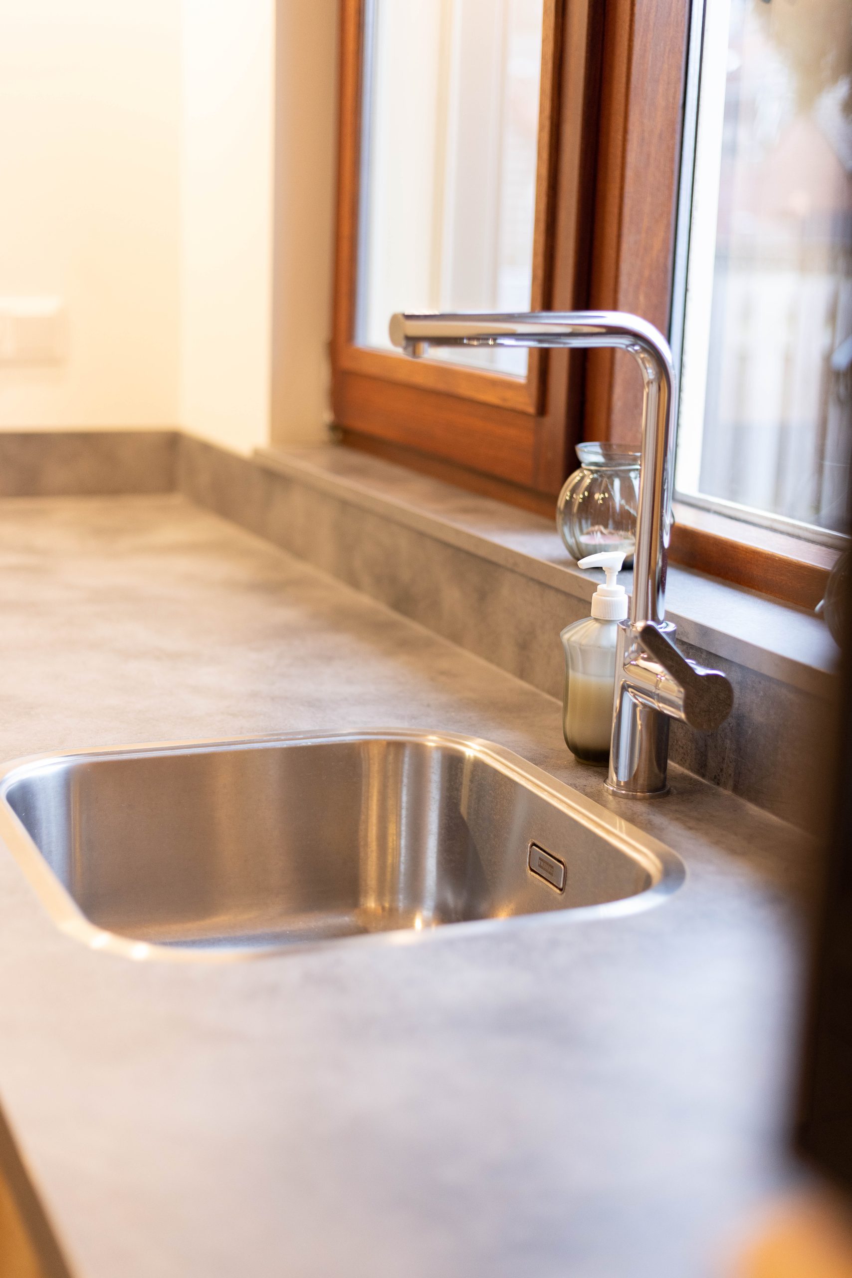 We hebben nieuwe fronten en andere grepen geplaatst, wat meteen een andere sfeer geeft. De effen aluminium achterwand zorgt voor een strakke, rustige uitstraling. Daarnaast hebben we het schilderwerk aangepakt en zowel de afzuigkap als de koelkast vervangen.