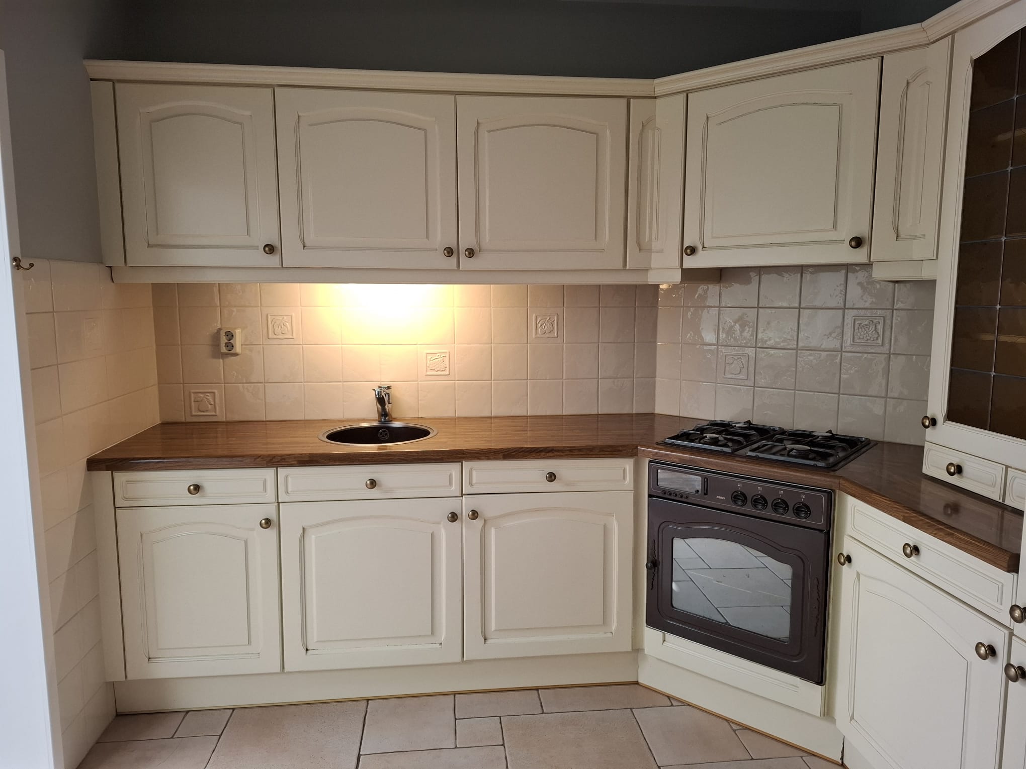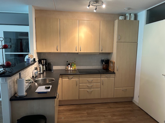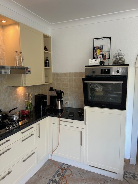 Er is een nieuw kunststof werkblad geplaatst dat tevens is verlengd. Onder dit verlengde blad zijn extra kasten geplaatst, wat zorgt voor meer opbergruimte en een praktischere indeling. Daarnaast hebben we een extra servieskast gemaakt in dezelfde stijl als de bestaande keuken, zodat alles mooi op elkaar aansluit.